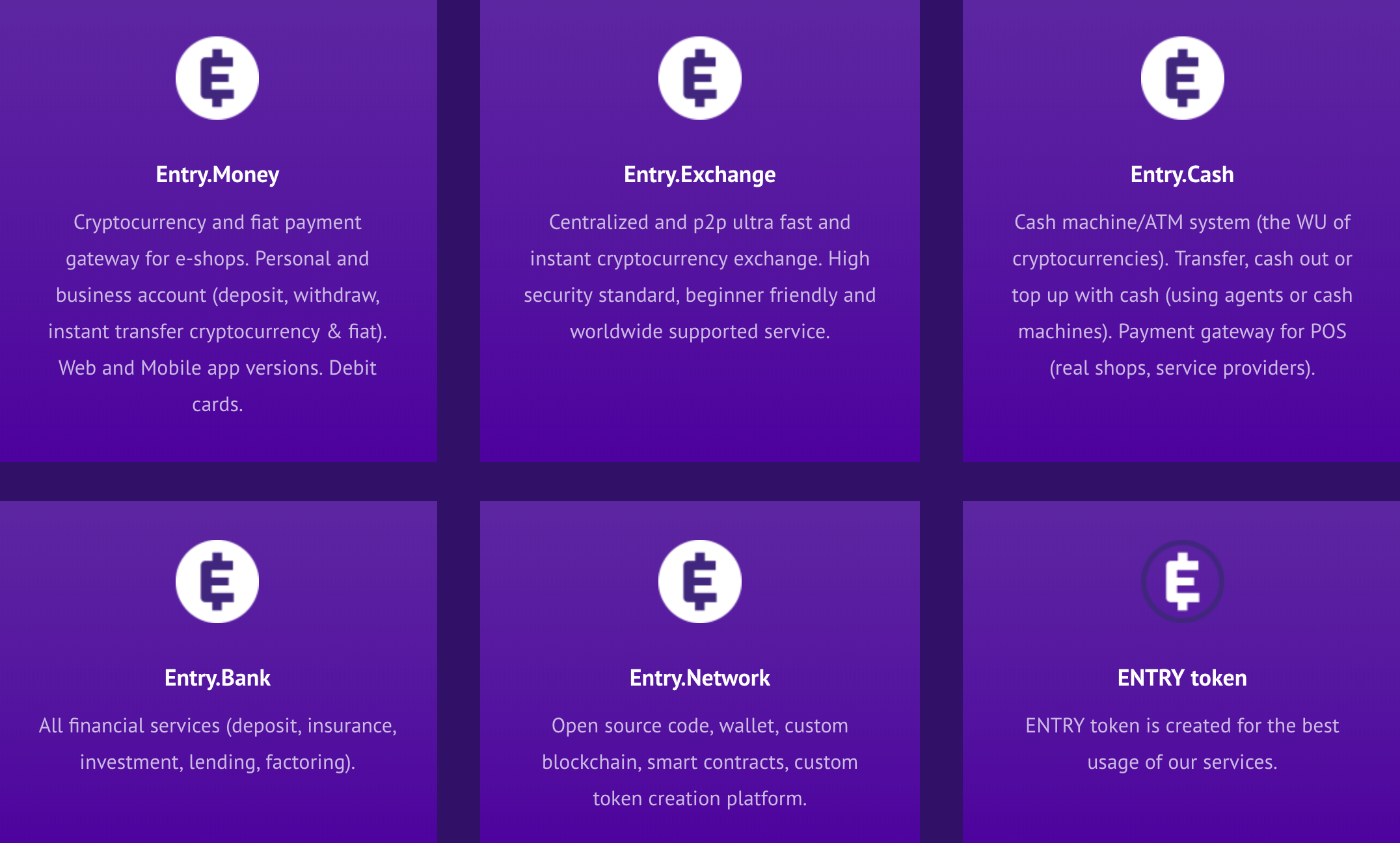 - Entry.Cash – виртуальный банкомат, предназначенный для получения наличных денег со своего кошелька Entry. Компания намерена предоставлять пользователям бесплатные дебетовые карты для оплаты товаров и услуг, снятия наличных средств в целях глобального распространения цифровых валют.